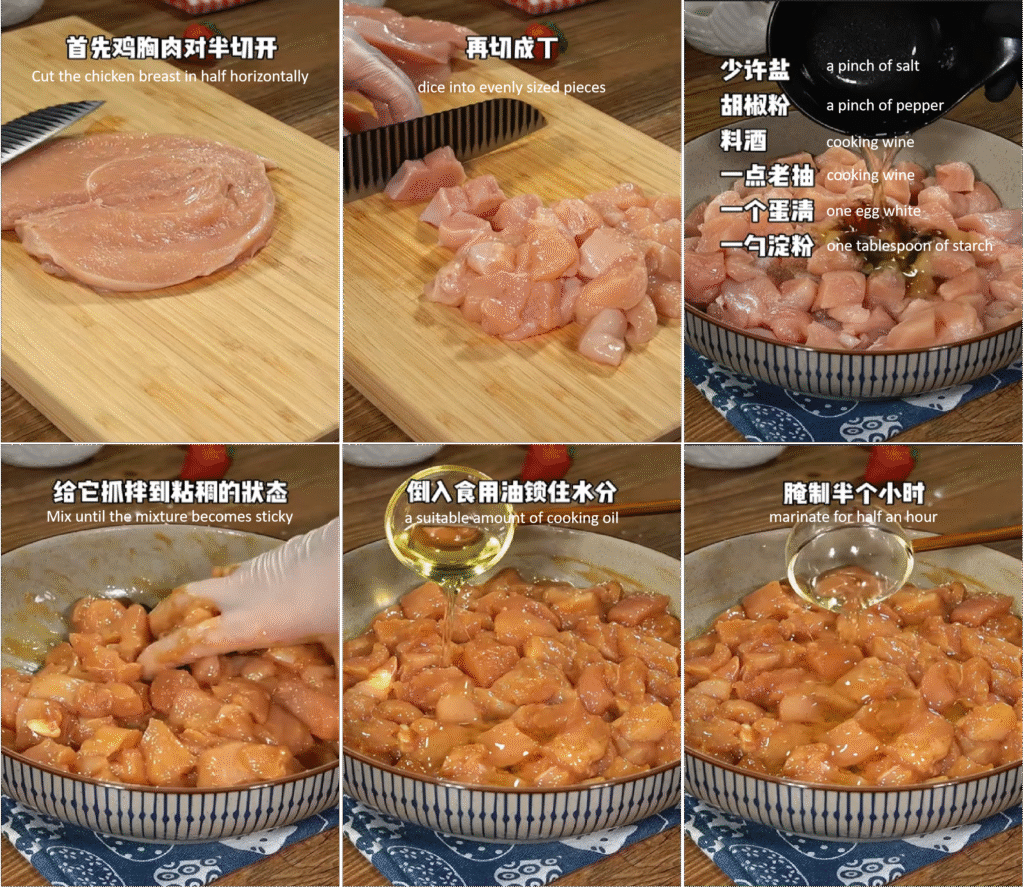 ① Cut the chicken breast in half horizontally, then dice into evenly sized pieces. Place in a bowl and add a pinch of salt, pepper, cooking wine, a little dark soy sauce, one egg white, and one tablespoon of starch. Mix until the mixture becomes sticky. Drizzle with a suitable amount of cooking oil to lock in the moisture, and marinate for half an hour.