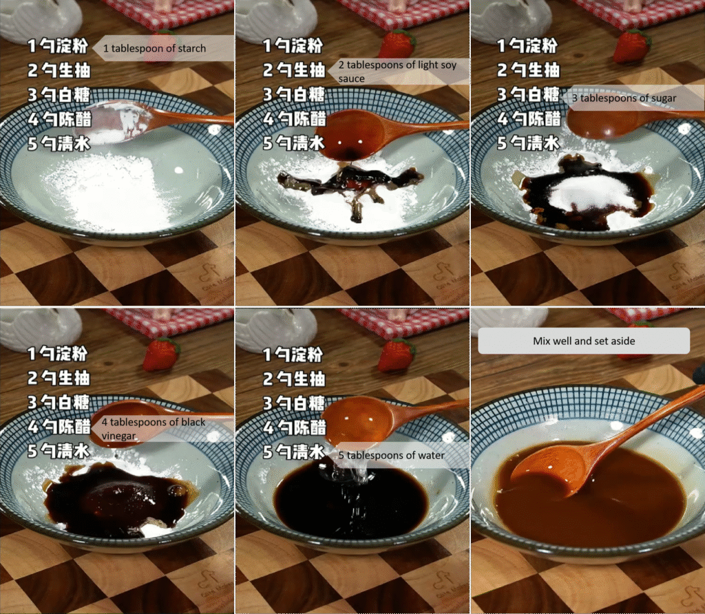 ② Prepare the sauce: In an empty bowl, combine 1 tablespoon of starch, 2 tablespoons of light soy sauce, 3 tablespoons of sugar, 4 tablespoons of black vinegar, and 5 tablespoons of water. Mix well and set aside.