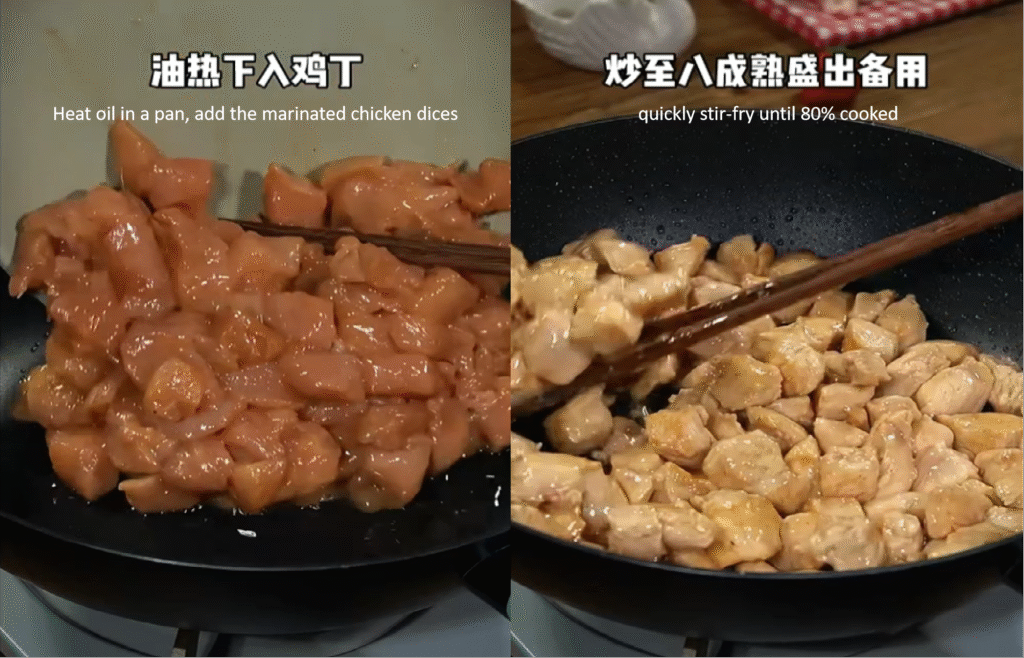 ③ Heat oil in a pan, add the marinated chicken dices, and quickly stir-fry until 80% cooked (the surface turns white while the inside remains slightly translucent). Remove and set aside.