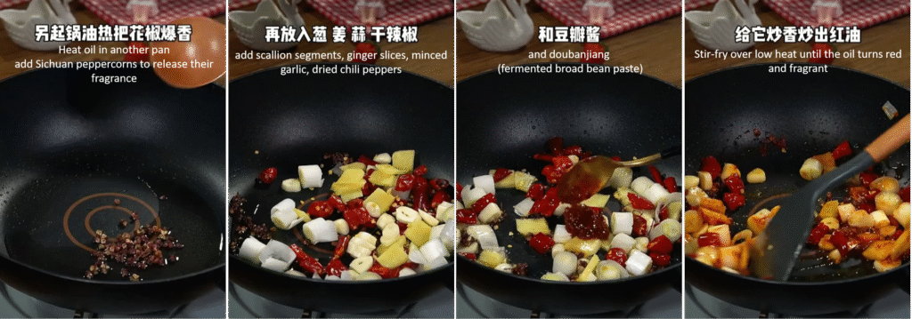 ④ Heat oil in another pan, add Sichuan peppercorns to release their fragrance, then add scallion segments, ginger slices, minced garlic, dried chili peppers, and doubanjiang (fermented broad bean paste). Stir-fry over low heat until the oil turns red and fragrant.