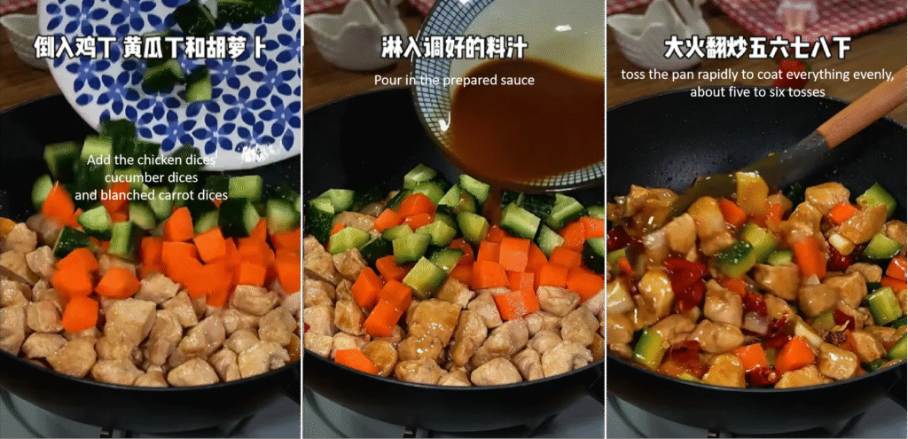 ⑤ Add the chicken dices, cucumber dices, and blanched carrot dices to the pan. Turn the heat to high and stir-fry quickly a few times. Pour in the prepared sauce and toss the pan rapidly to coat everything evenly, about five to six tosses.