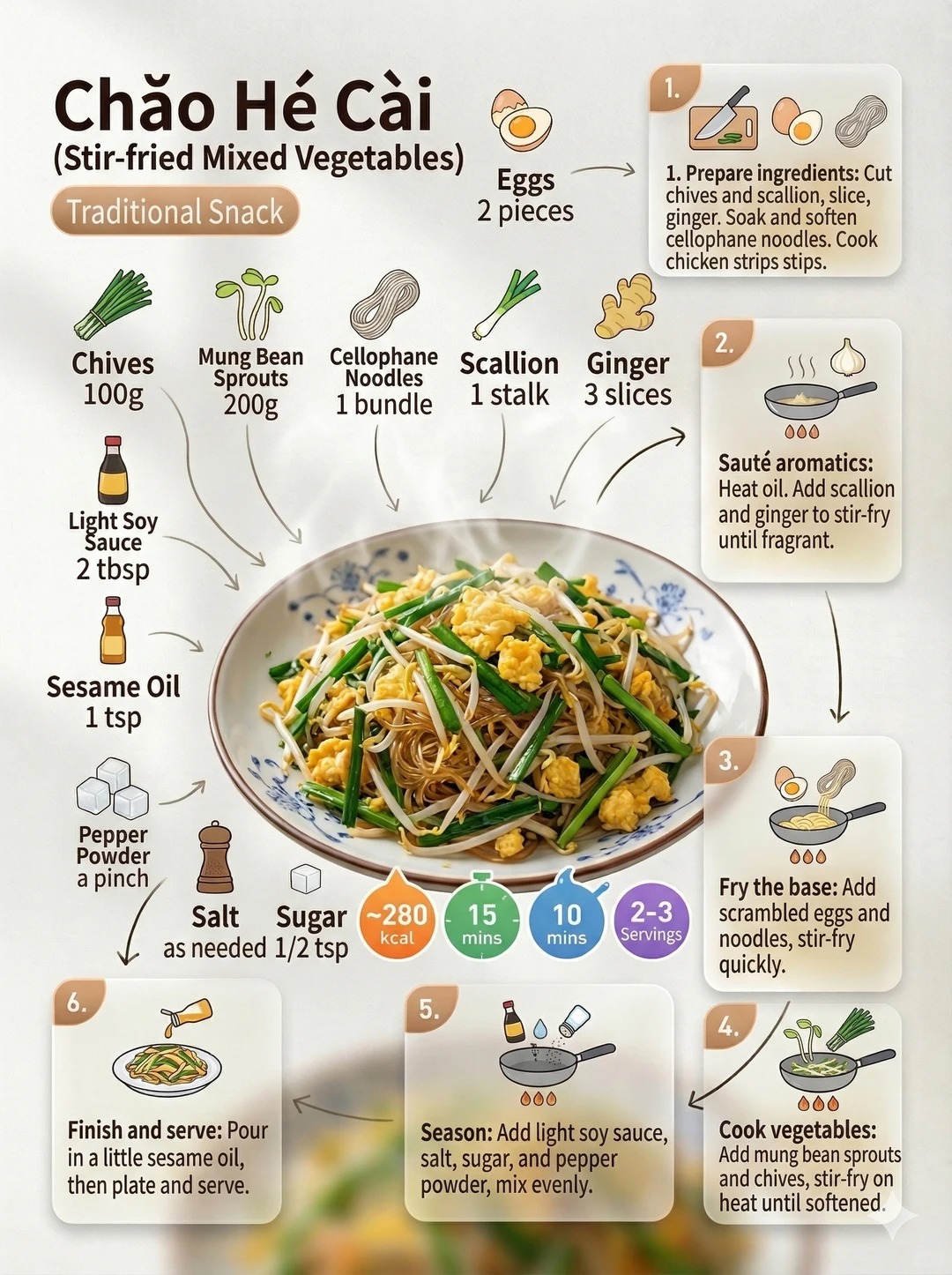 3️⃣ High heat, quick stir-fry, avoid overcooking: Chives and bean sprouts release water very easily. You must stir-fry over high heat the entire time. Cook just until done, then remove from heat immediately to preserve that crisp, refreshing crunch.