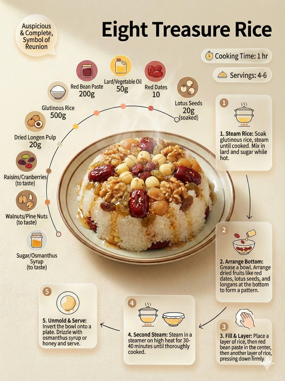 1️⃣ Lard is the secret: While the steamed glutinous rice is still hot, be sure to mix in lard and sugar! This is key to achieving that glossy, smooth texture in eight-treasure rice—it’s absolutely essential.