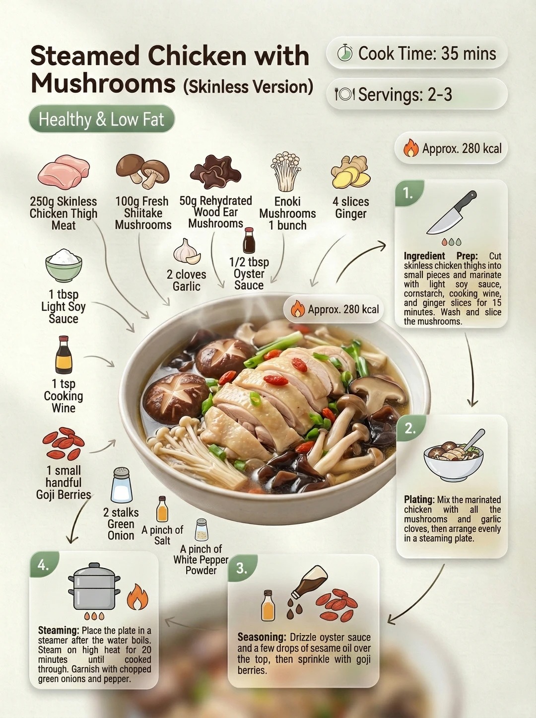 3️⃣ Steam over boiling water on high heat: Adjust the time based on the size of the chicken pieces—around 15 minutes is usually ideal. Oversteaming will make the meat tough.